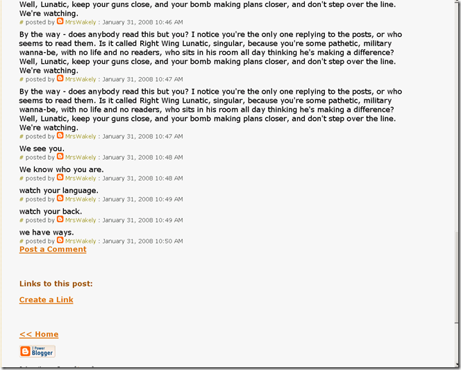 By the way - does anybody read this but you? I notice you're the only one replying to the posts, or who seems to read them. Is it called Right Wing Lunatic, singular, because you're some pathetic, military wanna-be, with no life and no readers, who sits in his room all day thinking he's making a difference? Well, Lunatic, keep your guns close, and your bomb making plans closer, and don't step over the line. We're watching.